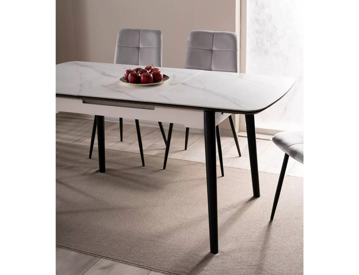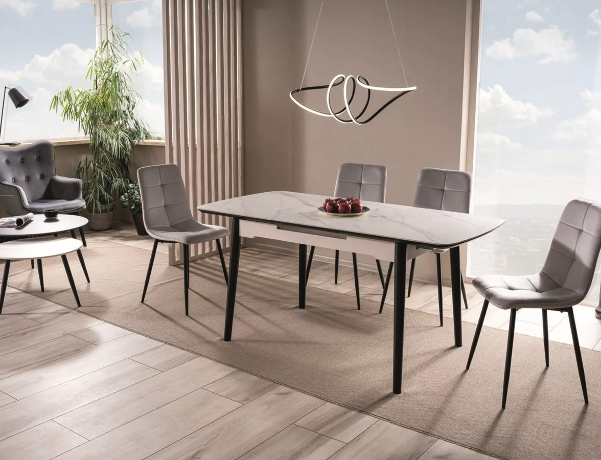 Matně bílá deska s mramorovou texturou na matně černé kovové konstrukci – tato kombinace nikdy nezestárne. APOLLO zapadne do moderního minimalistického bytu i do industriálního loftu. Je to statement kus, který povýší každý prostor.