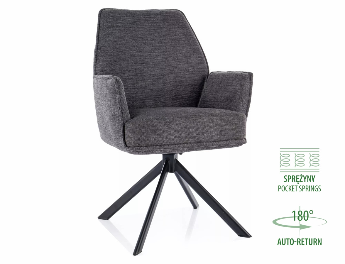 Materiál potahu: tkanina Brego Konstrukce: kov Otočný mechanismus: 180° s funkcí auto-return Pružení: kapsičkové pružiny v sedáku