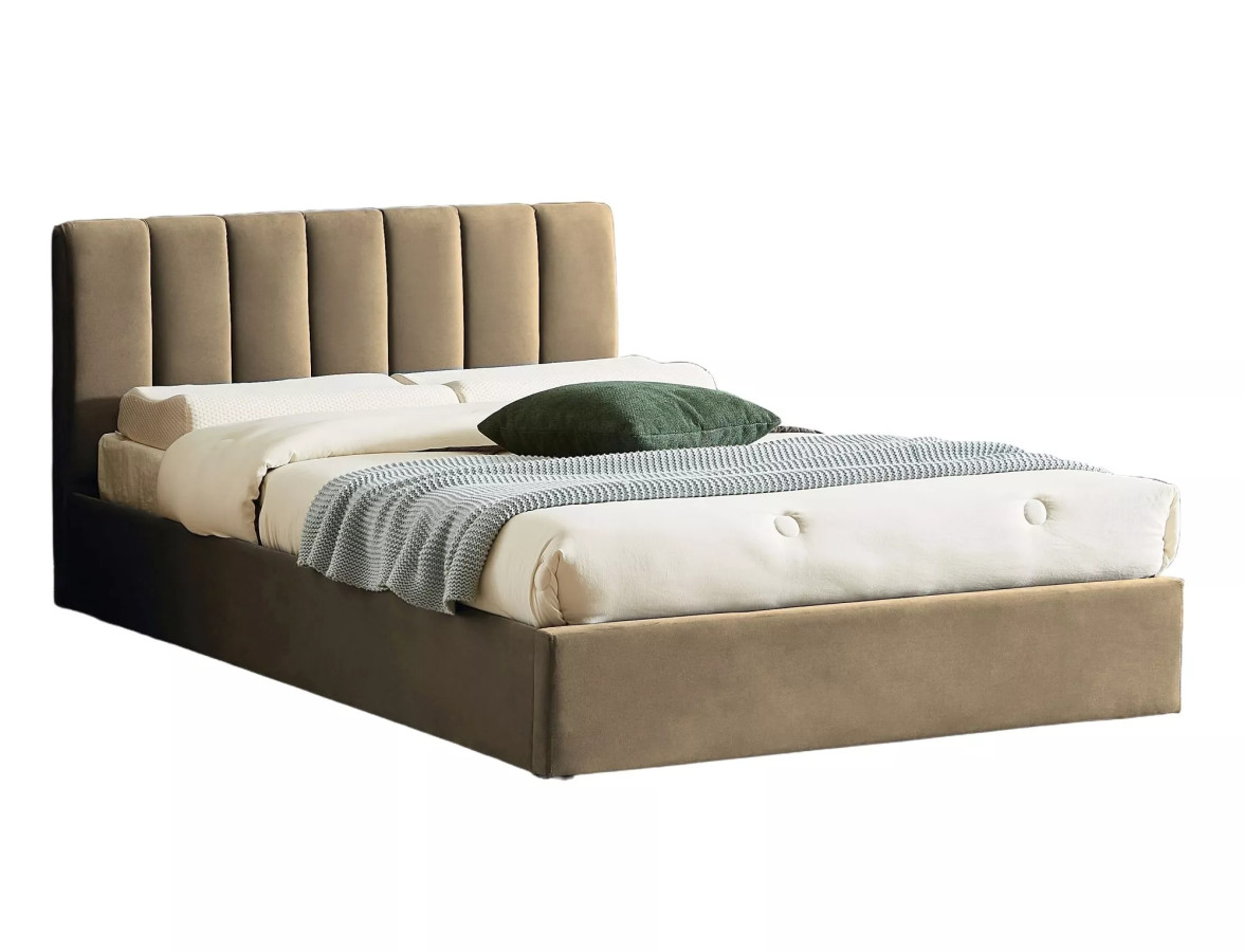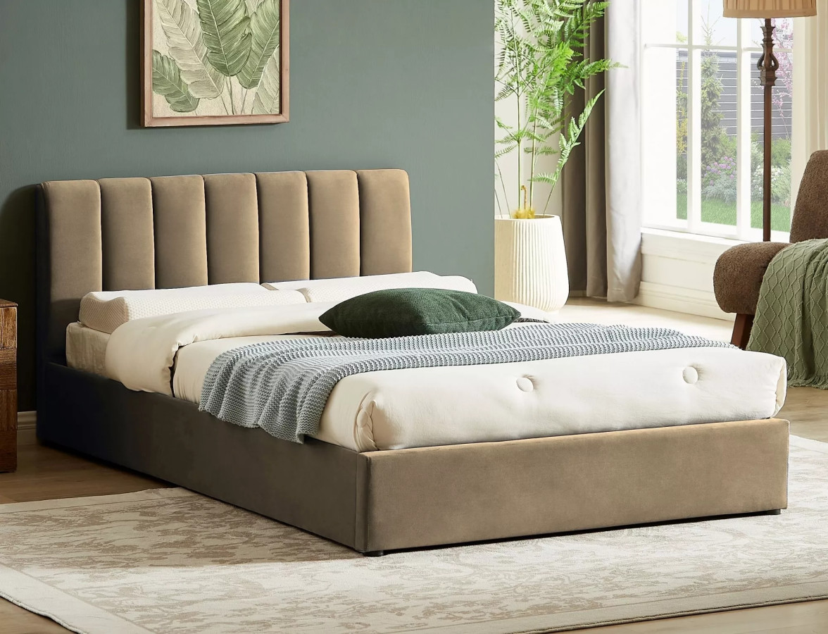 Čalounění z aksamitové látky Bluvel v béžové barvě č. 28 okamžitě povýší celý interiér ložnice. Jemný, hebký povrch zve k dotyku a teplý béžový odstín ladí s prakticky jakýmkoliv stylem – od skandinávského minimalismu až po moderní glamour.