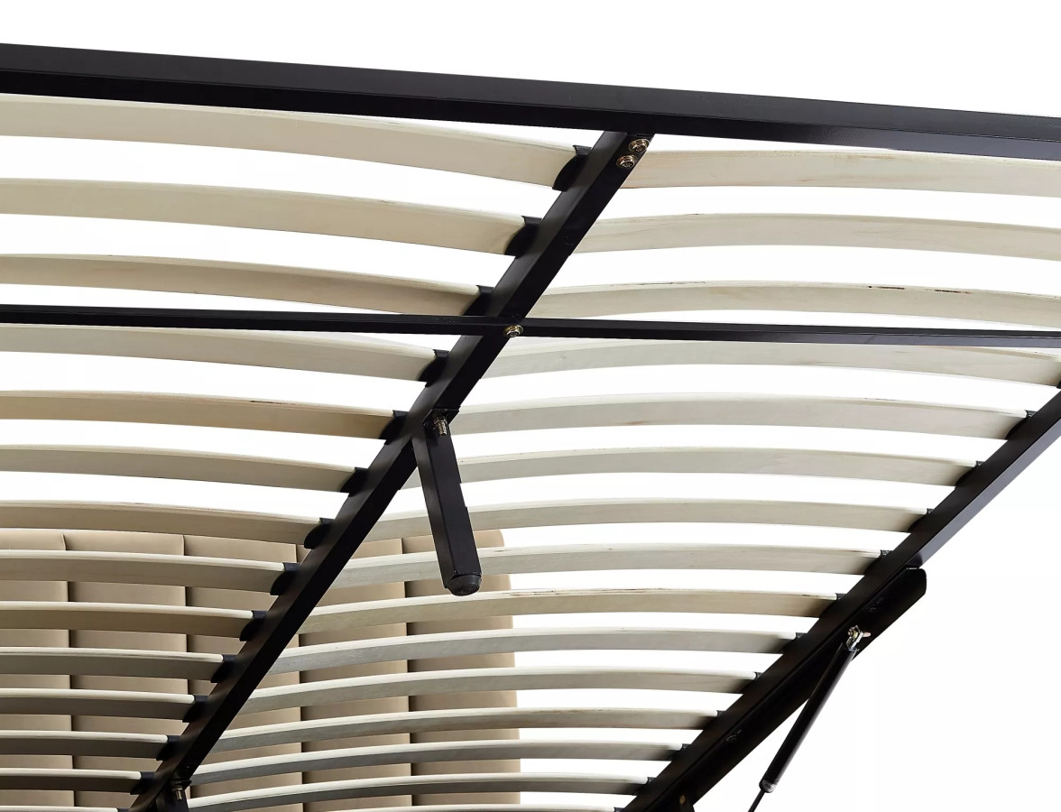 Pod matrací se skrývá prostorný úložný box s měkkým dnem – ideální pro přikrývky, polštáře, sezónní oblečení nebo cokoliv, co chcete mít po ruce, ale mimo dohled. Díky plynovým vzpěrám rošt zvednete jedním prstem bez námahy a bez hluku.