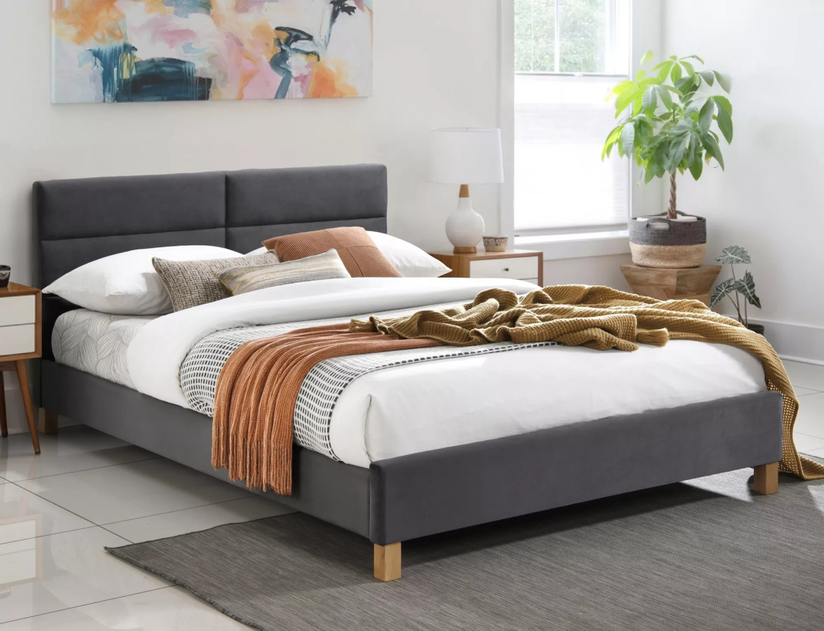 Kombinace šedého sametu a detailů v dekoru dubu vytváří nadčasový kontrast – moderní a přitom teplý. Postel skvěle zapadne do minimalistické i skandinávské ložnice, stejně jako do klasického interiéru.