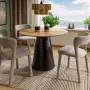 - Design, který zaujme: Kombinace teplého dubu s matně černým lakovaným podnožím doslova magnetizuje pohledy. Kulatý tvar stolu přináší plynulost do každého prostoru a láká k posezení.