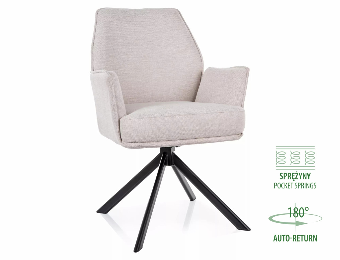 Materiál potahu: tkanina Brego Konstrukce: kov Otočný mechanismus: 180° s funkcí auto-return Pružení: kapsičkové pružiny v sedáku