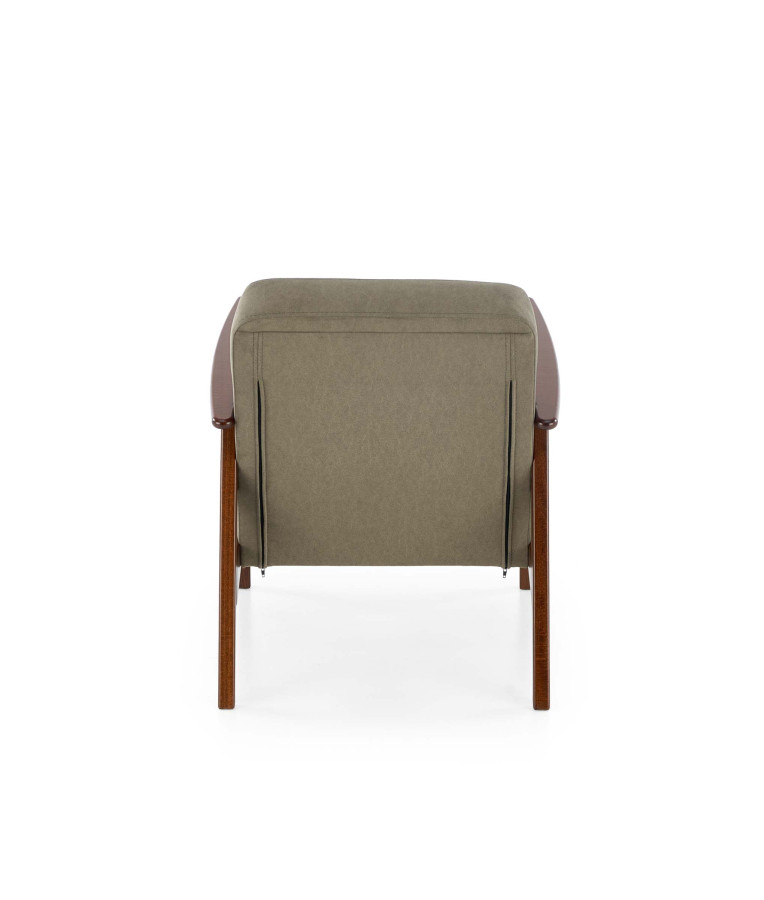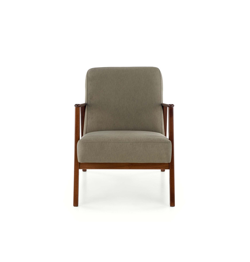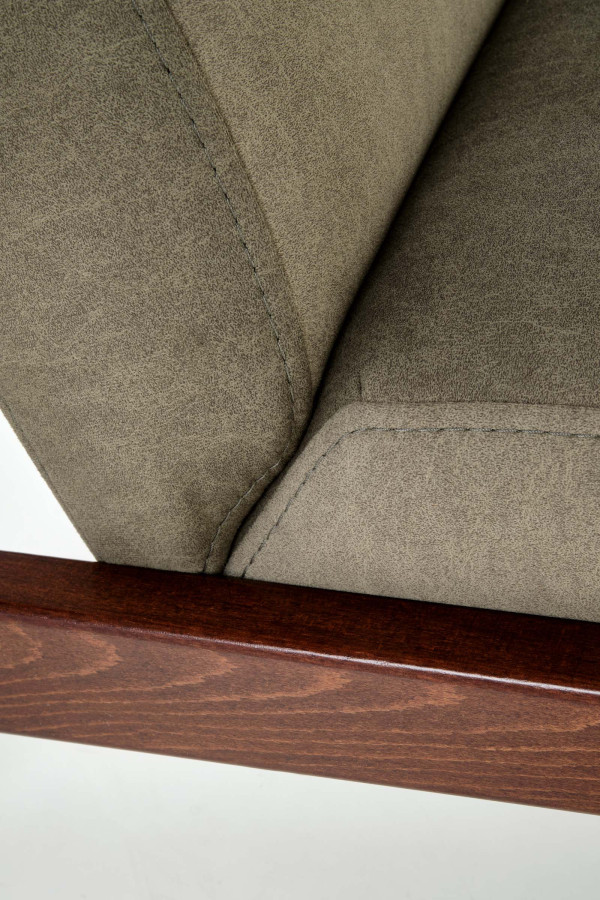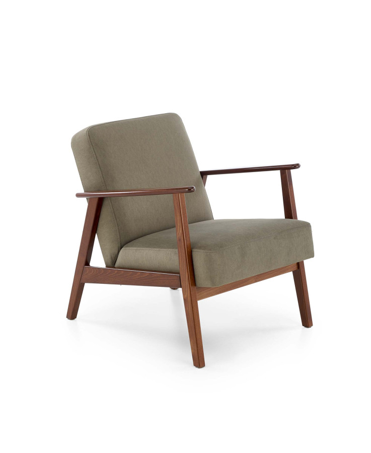 Křeslo MILANO 1S není výsledkem masové výroby bez duše. Je to mistrovské spojení masivního bukového dřeva v odstínu tmavého ořechu s noblesní zelenou látkou Castel.