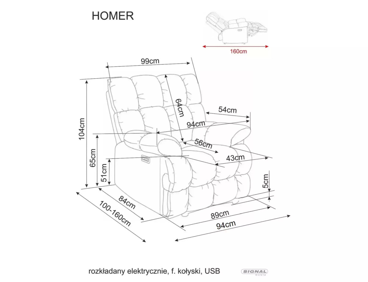 Křeslo HOMER je daleko více než jen obyčejný kus nábytku – je to váš osobní relaxační společník, který myslí na váš komfort za vás a který v sobě spojuje vše, co od dokonalého odpočinkového křesla očekáváte a ještě mnohem více. Elektrické polohování vám dopřeje luxus bez námahy, funkce houpání vás uklidní a uvolní, integrovaný USB port zajistí, že budete vždy připojeni a nabiti, a nadstandardní polstrování vás obejme tak, že se vám z křesla prostě nebude chtít vstávat. HOMER je investicí do vaší pohody, zdraví a kvality každodenního odpočinku, která se vám vrátí s každým okamžikem stráveným v jeho objetí.