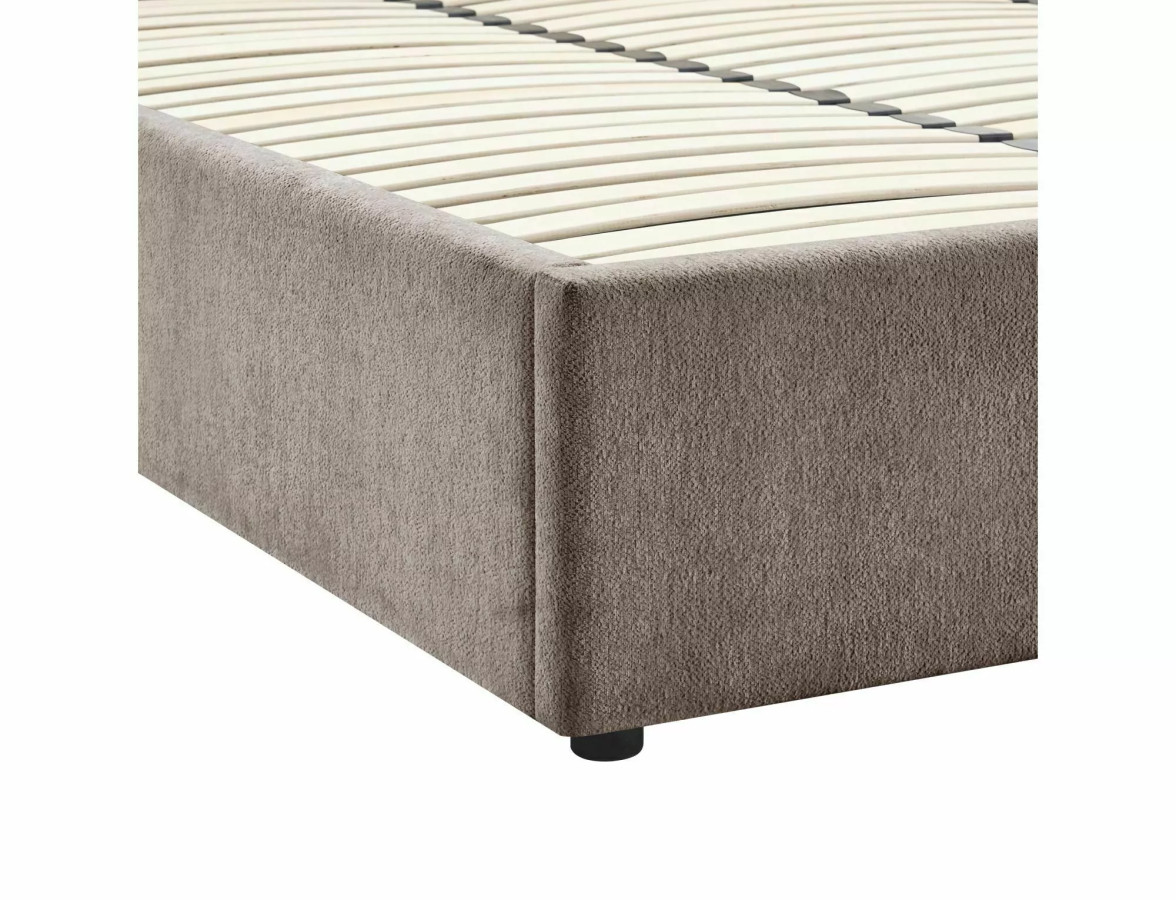 Díky svému nízkému profilu a subtilním nožkám působí postel v prostoru velmi lehce, téměř jako by se vznášela nad podlahou. Přesto si zachovává robustní stabilitu. Široký rám kolem matrace dodává posteli na monumentálnosti a zároveň slouží jako praktický lem.