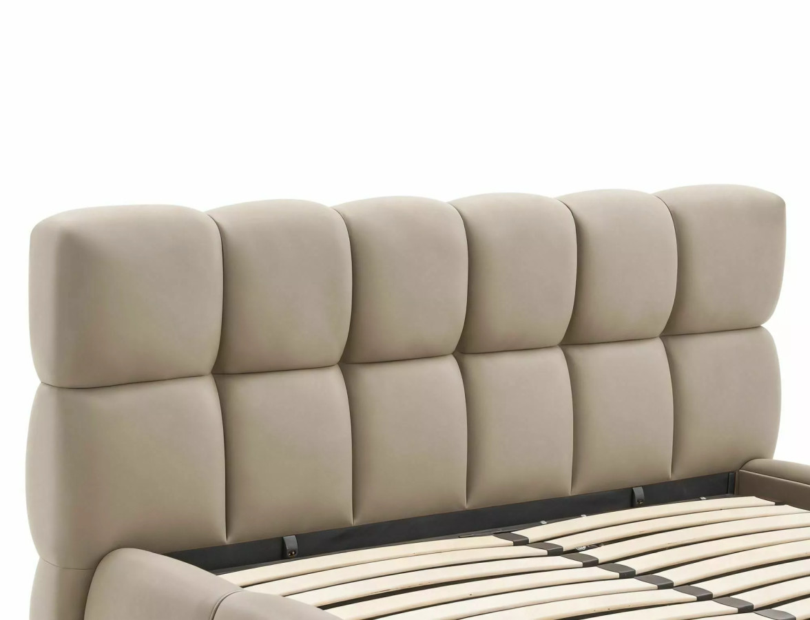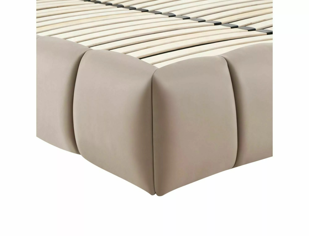 Elegantní čalouněná postel v odstínu tmavé béžové potažená kvalitní látkou VELVET okamžitě promění vaši ložnici v místo, kde se budete cítit skutečně jako doma. Jemný, příjemný na dotek a přitom odolný materiál dodává posteli sofistikovaný vzhled, který nepřestane bavit.